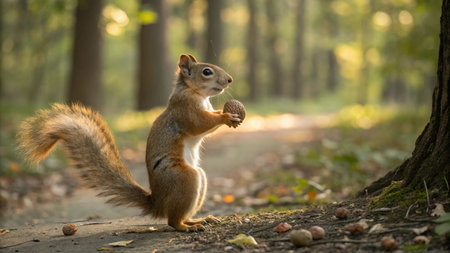 Squirrel eating acorn in the autumn forest. Wild animal.
