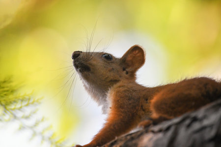 A European red squirrel on a beautiful background. Sciurus vulgaris.
