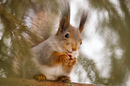 Gray-red squirrel sitting on a pine tree and eats. Outdoors, close-up.