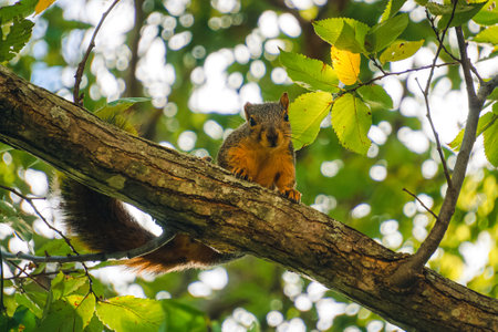 Squirrel on a tree branch in autumn, with colorful leaves in the background