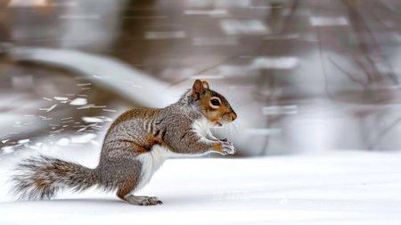 Squirrel Darting Across a Snowy Forest. Concept of Wildlife, Winter, Nature, Animal Movement, Fast Speed, Beauty in Motion, Freeze Frame.