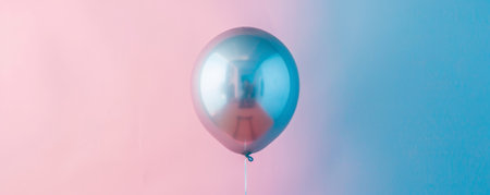 Pink balloon floating in the air with pink ribbon on blue and pink background