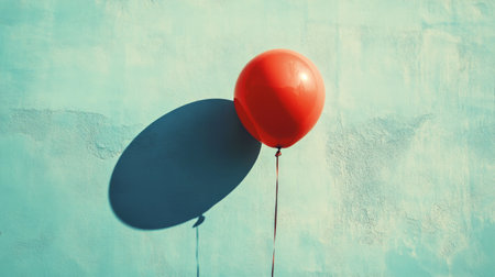 A red balloon floating against a white wall, casting a soft shadow behind it.