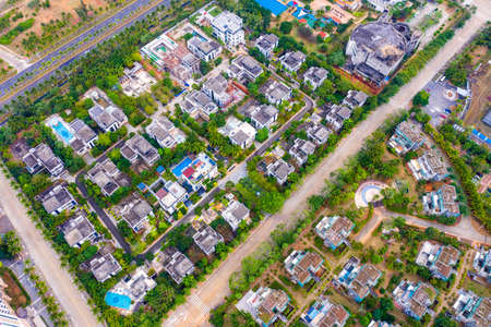 New development real estate. Aerial view of residential houses and driveways neighborhood during a fall sunset or sunrise time. Tightly packed homes. Top view over private houses in phuket thailand