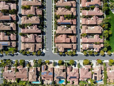 Aerial top view of residential modern subdivision luxury house neighborhood. South California, USA