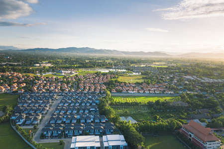 Housing estate or community in aerial view consist of garden, residential building. Real estate or property from land development by construction for sale, rent, buy, purchase, mortgage in Chiang Mai.