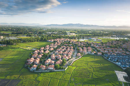 Aerial view of rice field and housing estate in Chiang Mai province of Thailand.