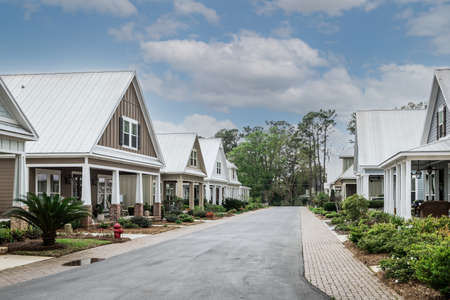 Small american town residential complex in street and home with spring tree landscape