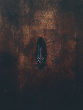Single Black Feather on Dark Brown Wooden Background Elegant Nature Photography Still Life Image art