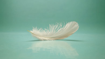 A soft, white feather gently floats atop a smooth water surface, reflecting beauty and tranquility against an aquamarine backdrop, evoking serenity and elegance.