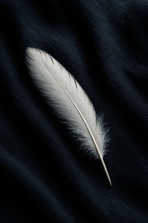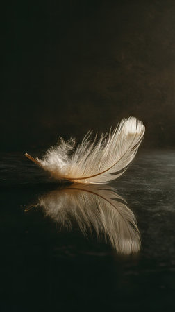 A single white feather is gently displayed above a glossy, reflective surface. The image highlights the feather's soft texture and subtle details, set against a dark, contrasting backdrop. The lighting creates a sense of depth, possibly suitable for editorial illustrations or artistic projects.