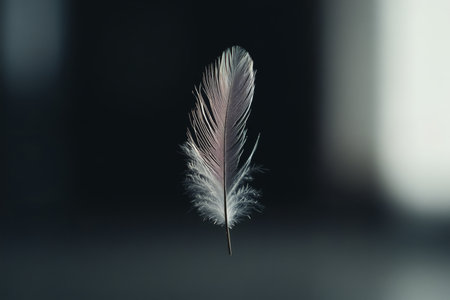 A softly illuminated feather hovers gracefully against a dark background, highlighting its delicate structure and intricate details. The interplay of light and shadow creates an ethereal quality that draws the eye.