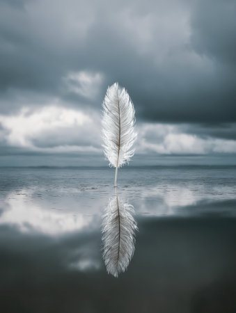 Delicate white feather gently floats on a calm, reflective water surface, creating a serene and minimalist scene. symbolizes lightness, peace, and tranquility.