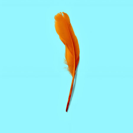 A stunning orange feather drifts gracefully against a soft pastel pink background, highlighting its delicate texture and beauty. Perfect for creative projects.