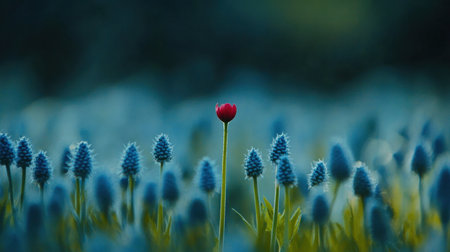 A striking red flower stands alone amidst a field of blue blossoms, capturing the essence of solitude and natural beauty in a serene meadow scene.
