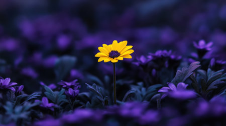 An isolated yellow flower stands out amidst a sea of purple blooms, creating a contrast in a natural environment. The photograph showcases a dark, moody aesthetic. The composition allows for commercial uses in design, advertising, and editorial content.