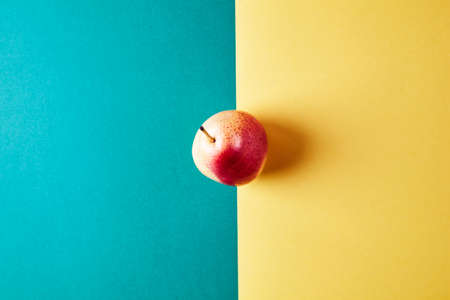 Fresh red apple top view on navy blue and yellow background banner with copy space