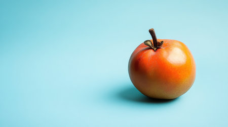 A single ripe persimmon fruit sits against a soft blue background, showcasing its vibrant orange hue and green leaf, ideal for food-related projects.