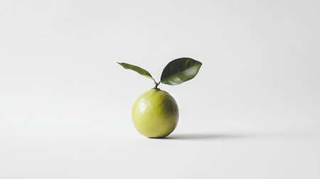 A lime with two attached leaves, sitting elegantly on a clean white background