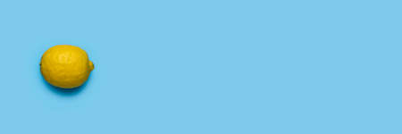 ripe whole yellow lemon on a blue background. Top view, flat lay. Banner.