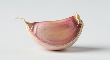 Fresh garlic clove, partially peeled, showcasing its vibrant purple pink skin and white flesh against a pristine white backdrop. essential ingredient for cooking, flavor, and healthy eating.