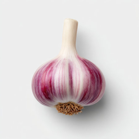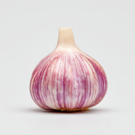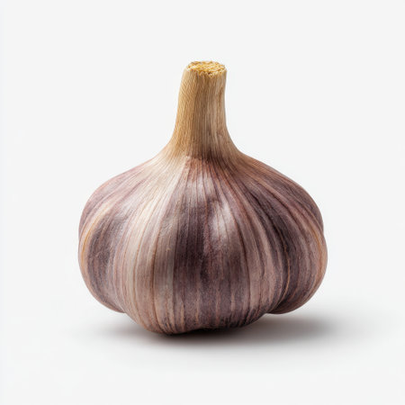 This image showcases a fresh whole garlic bulb with vibrant skin and natural textures set against a clean white background, ideal for culinary themes.