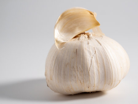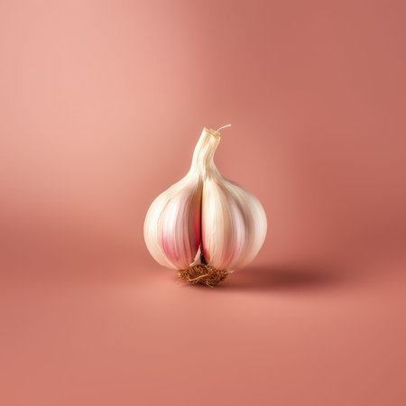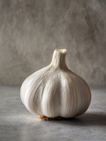 Garlic bulb positioned on a smooth surface, illuminated gently to accentuate its unique shape and color.