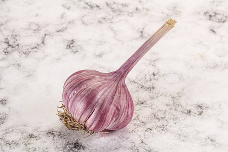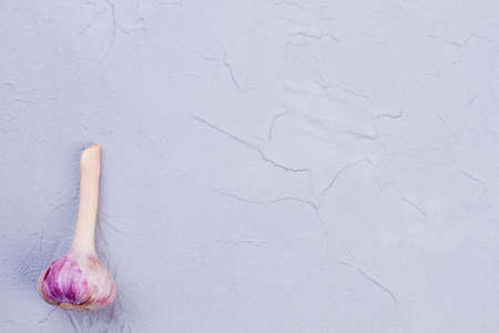 Fresh garlic on light textured background. One young purple garlic and copy space. Why to eat garlic.