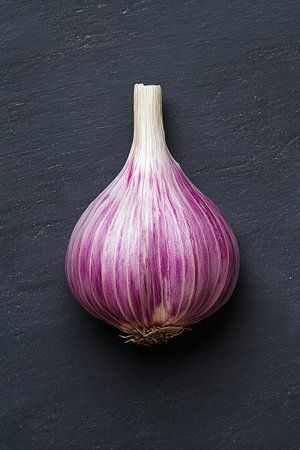 A whole fresh garlic bulb featuring striking purple and white stripes, ideal for culinary use, health benefits, and food photography. Perfect for various recipes.