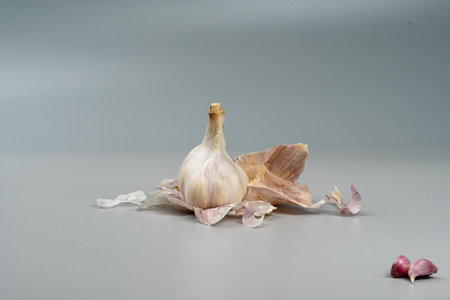 Head of garlic (Allium sativum) with its units still in the bulb and husk on a neutral background