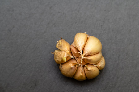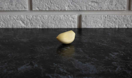 Garlic clove isolated on a black kitchen table background.