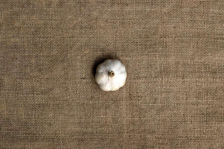 Garlic on jute fabric background. Spices for cooking meat.