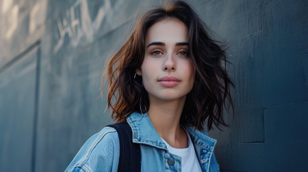 A young woman exudes casual confidence in this portrait She stands against a neutral backdrop, her denim jacket and backpack adding a touch of youthful energy Her relaxed pose and subtle smile capture a sense of independence and optimism The indoor setting provides a clean and contemporary feel AI Generative