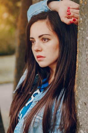 Portrait of beautiful dark-haired girl in jean dress on the city background