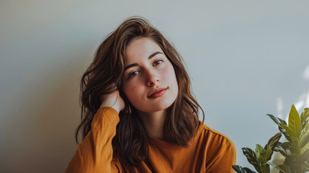A young woman with long wavy hair enjoys a peaceful moment outdoors. She smiles gently while engaging with her surroundings on a sunny day surrounded by natures beauty.