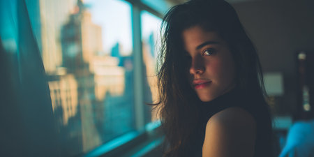 A young woman with dark hair looks over her shoulder towards the camera, with a city skyline blurred in the background through a window.