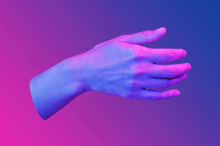 Hand in a pop art collage style in neon bold colors. Modern psychedelic creative element with human palm for posters, banners, wallpaper. Copy space for text. Magazine style template. Zine culture.