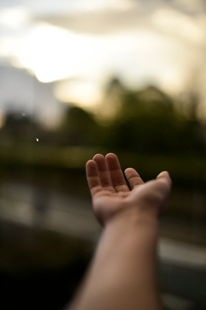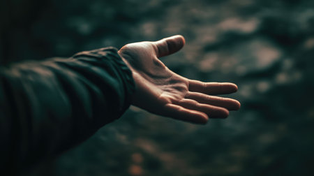 An open hand reaches out towards a softly blurred background, inviting a connection with nature. The gentle play of light and shadow evokes emotions.