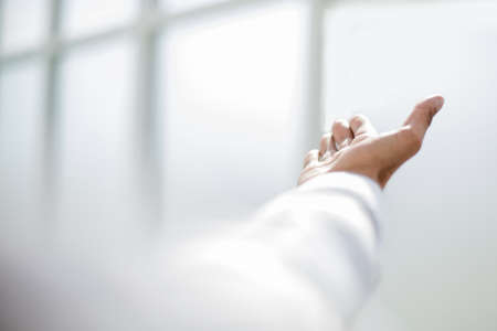 A close-up shot of an open hand, palm facing upwards, against a plain white background, suggesting offering, receiving, or presentation.