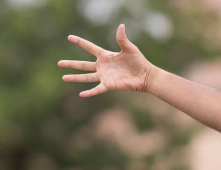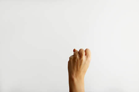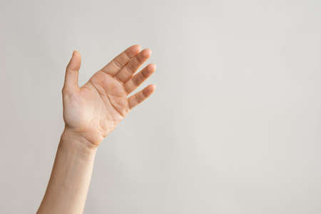 Hand gestures, to wave Hello. Greeting someone. light grey background