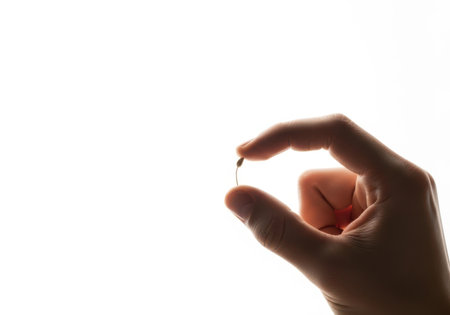 A human hand, silhouetted against a stark white backdrop, delicately holds a minuscule object between its thumb and forefinger.