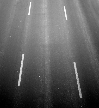 The asphalted road with two continuous white strips. The highway with a white marking. Concept long way, beginning something. black and white photo
