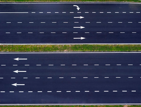 View from the top to the highway. Aerial drone shooting of a multi-lane road with moving vehicles. Car traffic in a big city