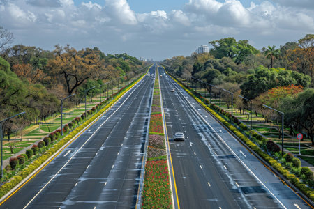 paved public road with white road markings for vehicles, Sunny day