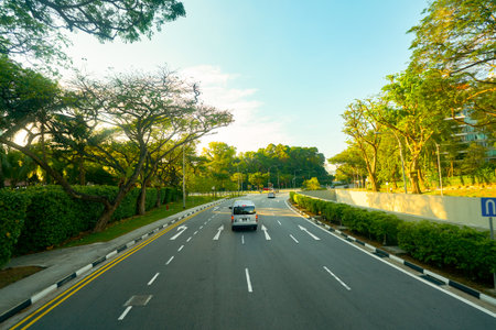 SINGAPORE - APRIL 04, 2019: Singapore urban landscape seen from second deck of double-decker bus.