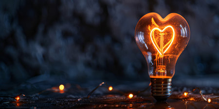 Glowing heart-shaped filament in light bulb, set on dark background. Perfect for romantic or cozy themes.