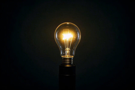 A warm glowing filament light bulb in focus with a dark bokeh background, symbolizing bright ideas, inspiration, and energy.