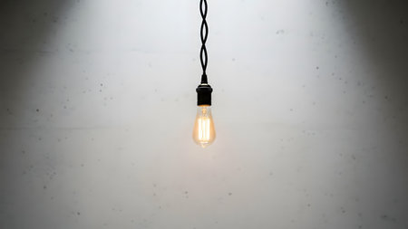 A vintage Edison-style light bulb hangs from a twisted black cord against a textured grey concrete wall. The illuminated filament casts a warm glow, creating a minimalist industrial aesthetic suitable for design or idea concepts.
