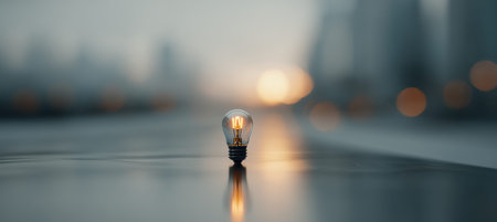 A single incandescent lightbulb glows brightly against a twilight sky, symbolizing the spark of innovation and creativity, perfect for presentations on new concepts and forward-thinking.