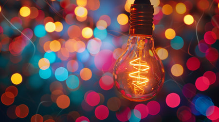 A glowing light bulb with colorful bokeh lights in the background, representing creativity, innovation, and bright ideas in a visually appealing composition.